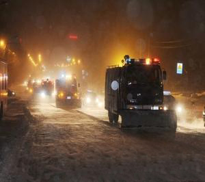 晚上21時(shí),天空飄著大雪,在人民大街與自由大路交匯處8輛由消防車改裝的清雪車格外引人注目,一輛清雪車尤顯特別,這輛車的前身自帶有除雪刷,在積滿厚雪的路面它可以一邊快速將壓實(shí)的冰雪清除,一邊可將路面的積雪迅速清掃干凈。這就是由長春市公安消防支隊(duì)的運(yùn)兵車改裝的除雪滾刷車。這輛車集推雪、掃雪、除冰等多種功能于一車,是非常先進(jìn)的清雪車。