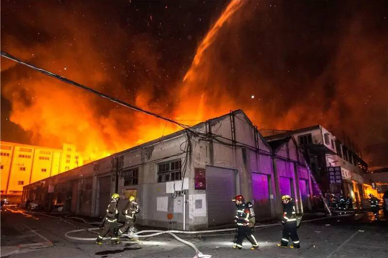 火災(zāi)發(fā)生在東門大廈北面的一個(gè)城中村,火勢(shì)極大,艮山西路停了40多輛消防車,僅留一個(gè)車道供東向西車附近的艮山西路和新塘路出現(xiàn)大面積擁堵。圖為火勢(shì)蔓延到周邊倉(cāng)庫(kù),消防員在現(xiàn)場(chǎng)奮力撲救。