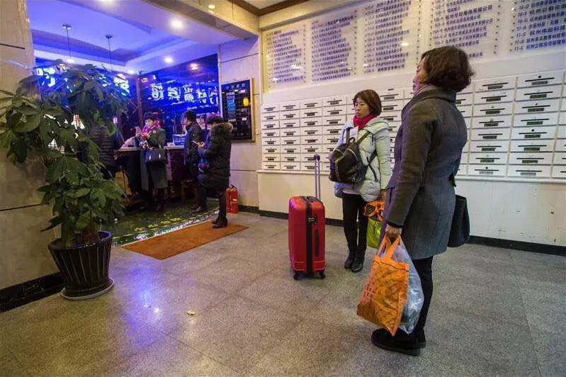 .東門大廈這邊有兩個(gè)酒店:東門賓館和布丁酒店。晚上8點(diǎn)多,住客都被叫起來。“賓館把我們趕下來了,說火勢(shì)太大,怕蔓延過來。”布丁酒店一個(gè)年輕女孩蹲在大門旁邊,呆呆地看著來來往往的行人。她實(shí)在無聊,便抽起了煙。圖為緊鄰火場(chǎng)的一家賓館,住客紛紛退房離開。